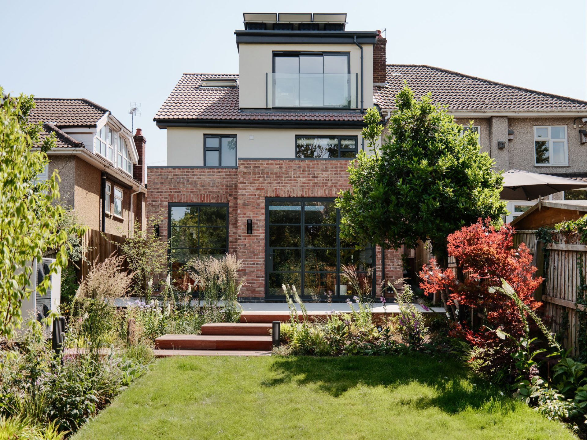 Whole house renovation including – remodelling the ground and first floors, adding a brick clad rear extension, carrying out a hip‑to‑gable loft conversion for a fourth bedroom and home office, and delivering a full sustainable upgrade – including external wall insulation, solar panels, underfloor heating and a heat pump – for a true whole‑house eco refurbishment.